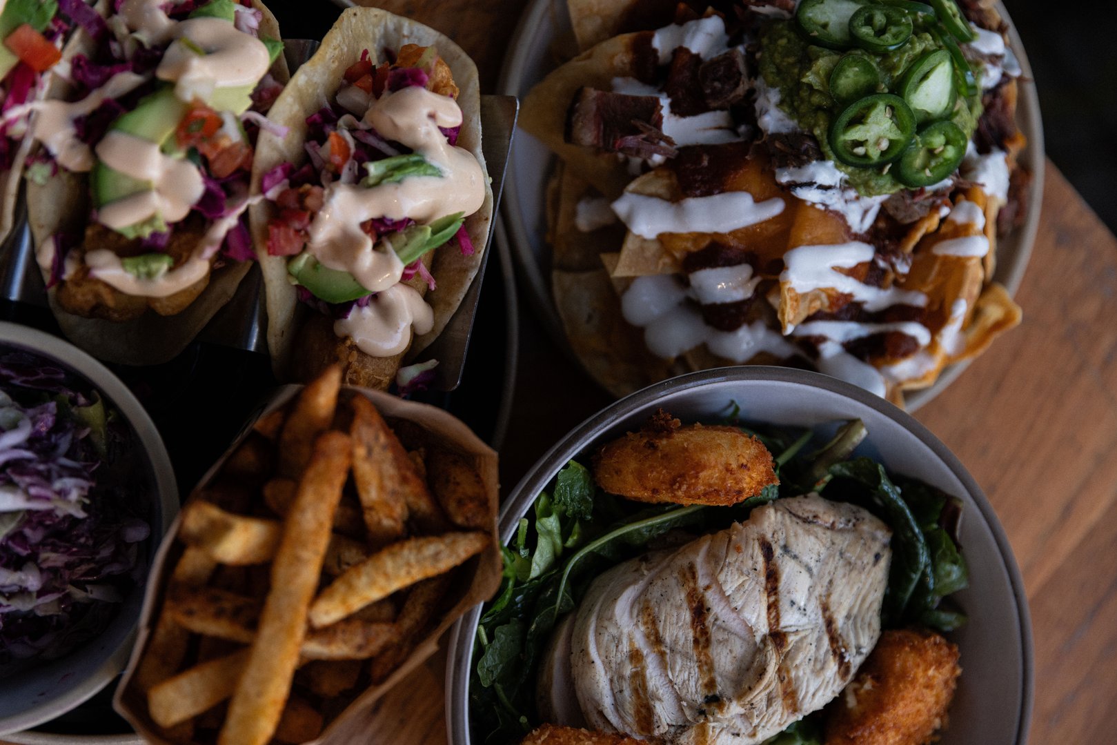 Beer-battered cod, shredded cabbage, avocado, chili aioli, pico de gallo, corn tortillas, cilantro lime rice, black beans